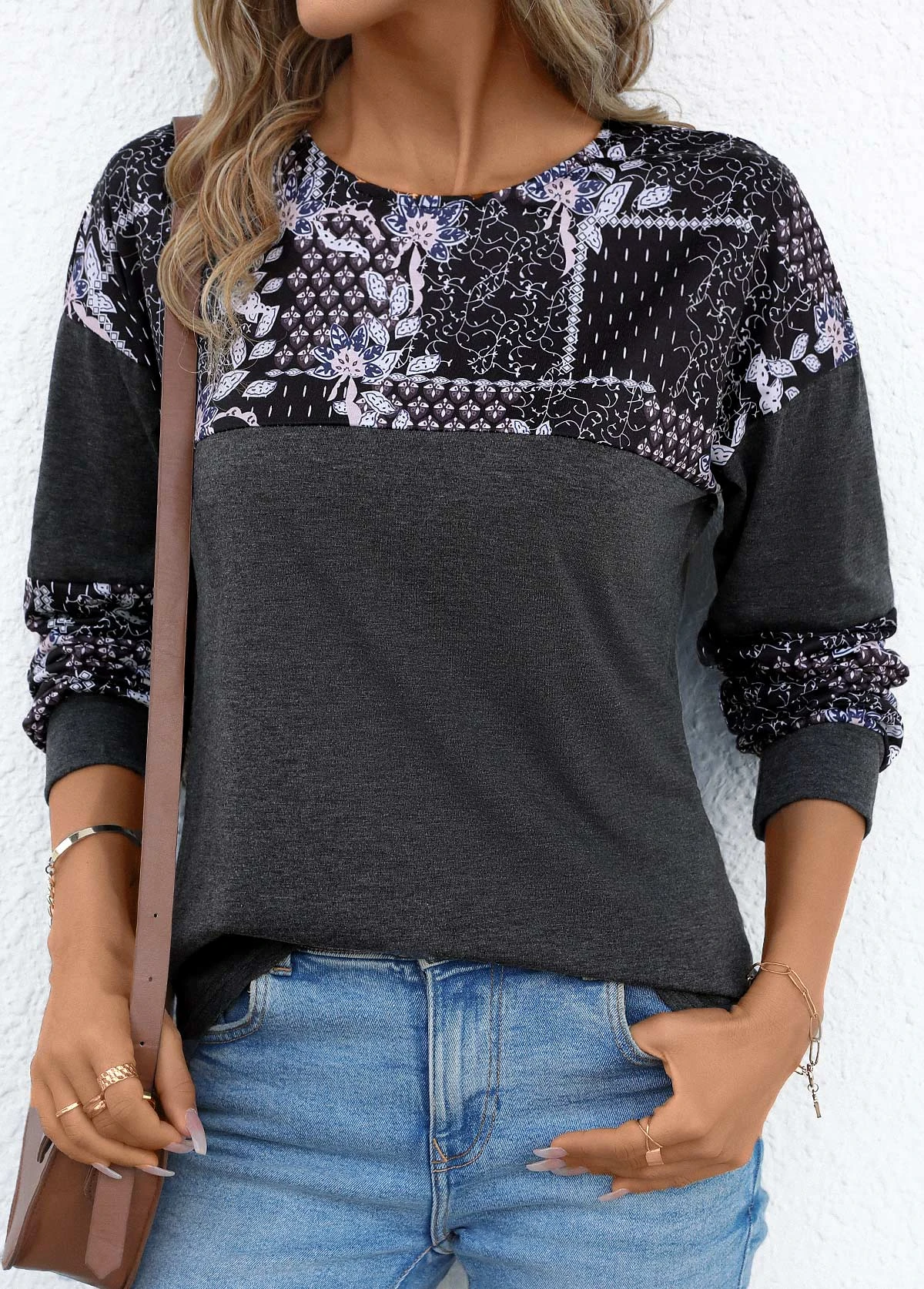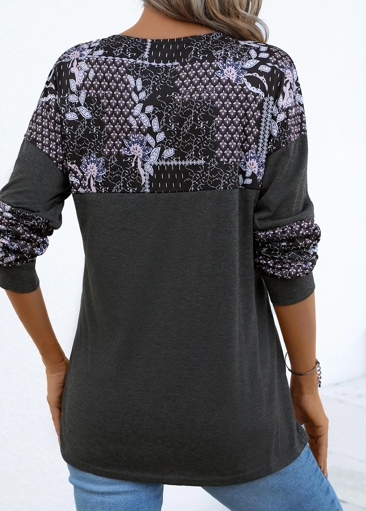 Dark Grey Patchwork Tribal Print Long Sleeve T Shirt