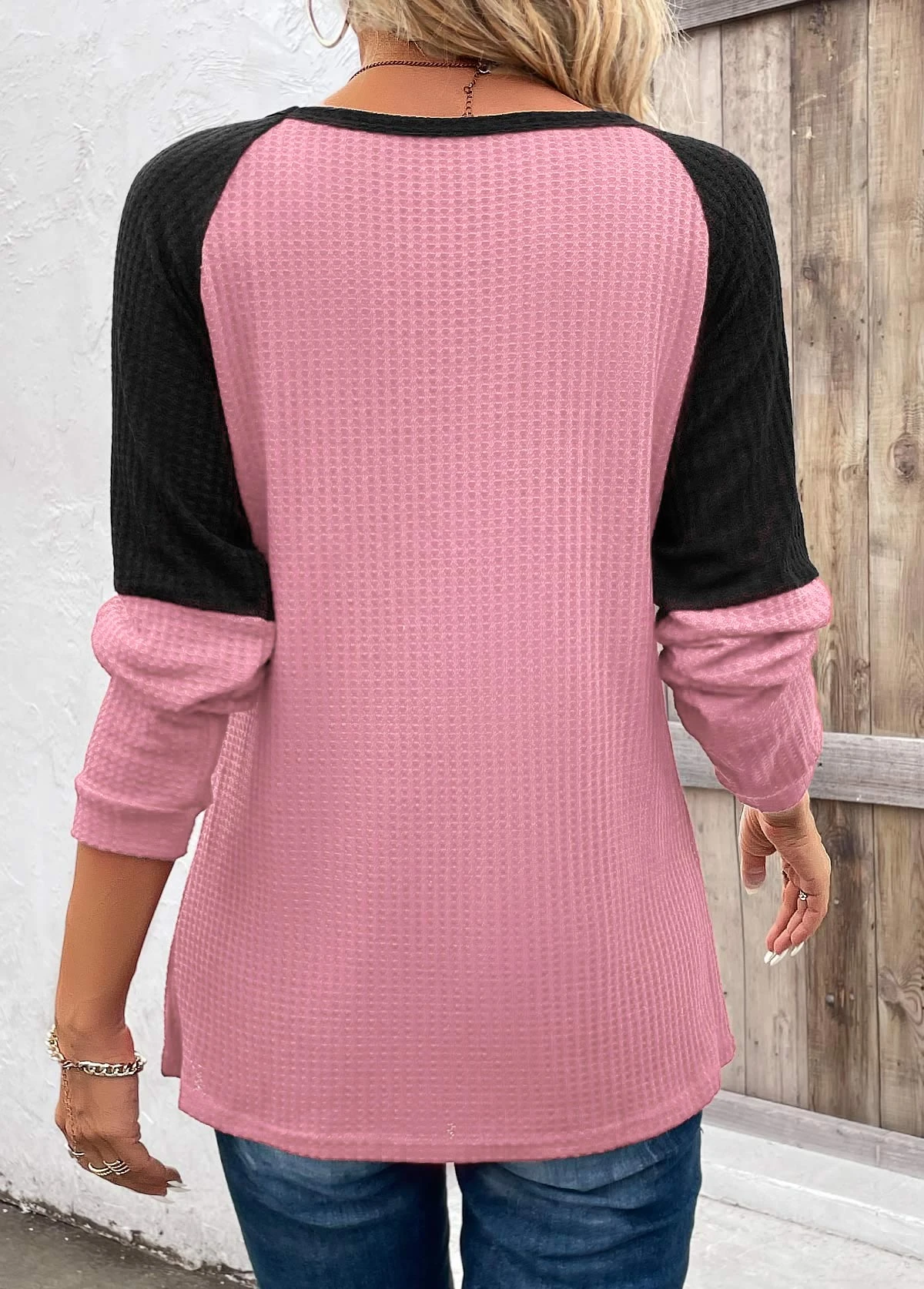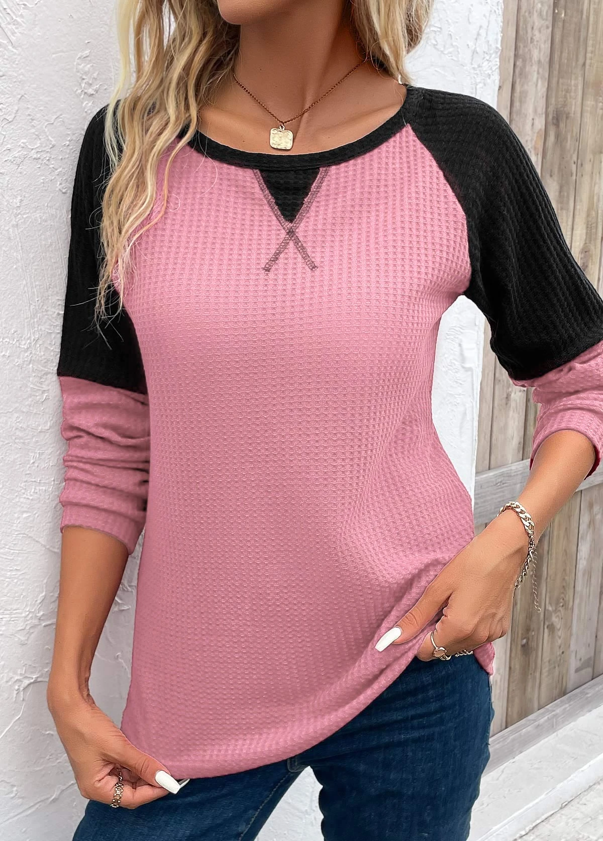 Pink Patchwork Long Sleeve Round Neck T Shirt