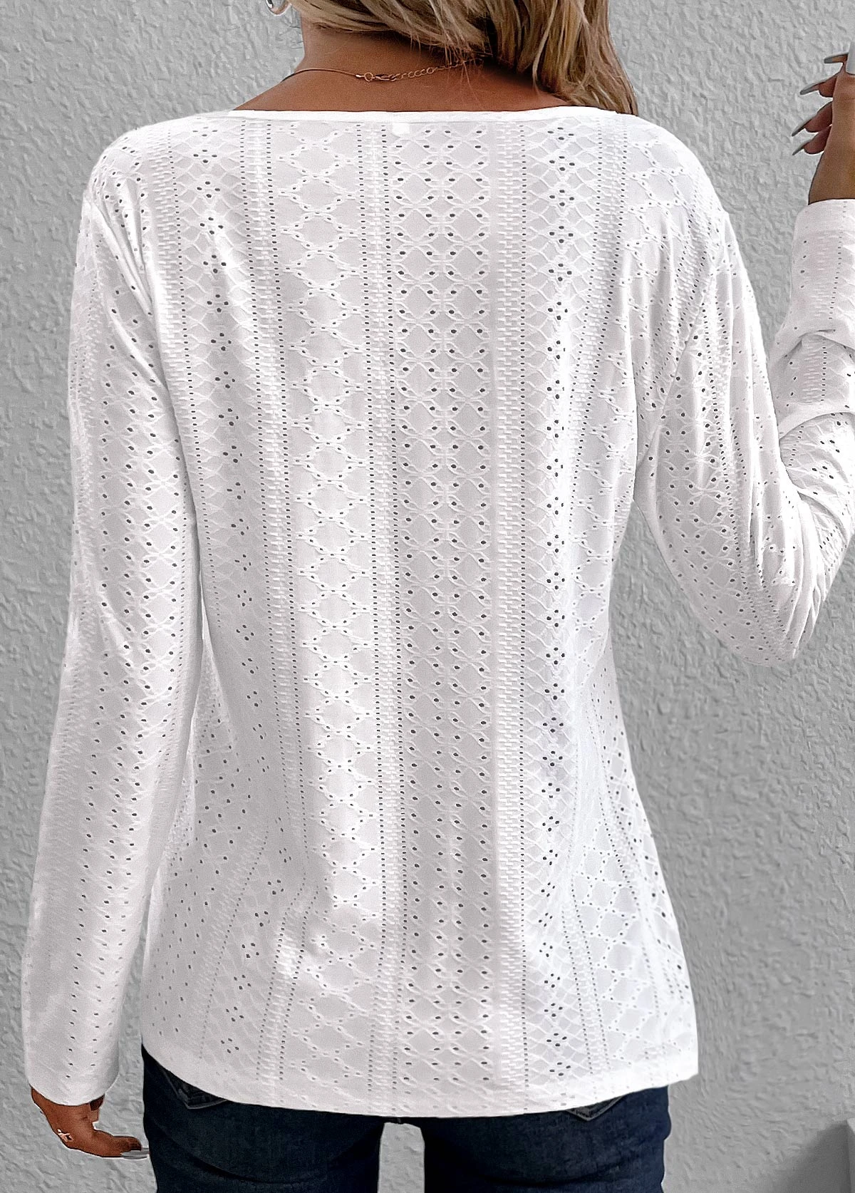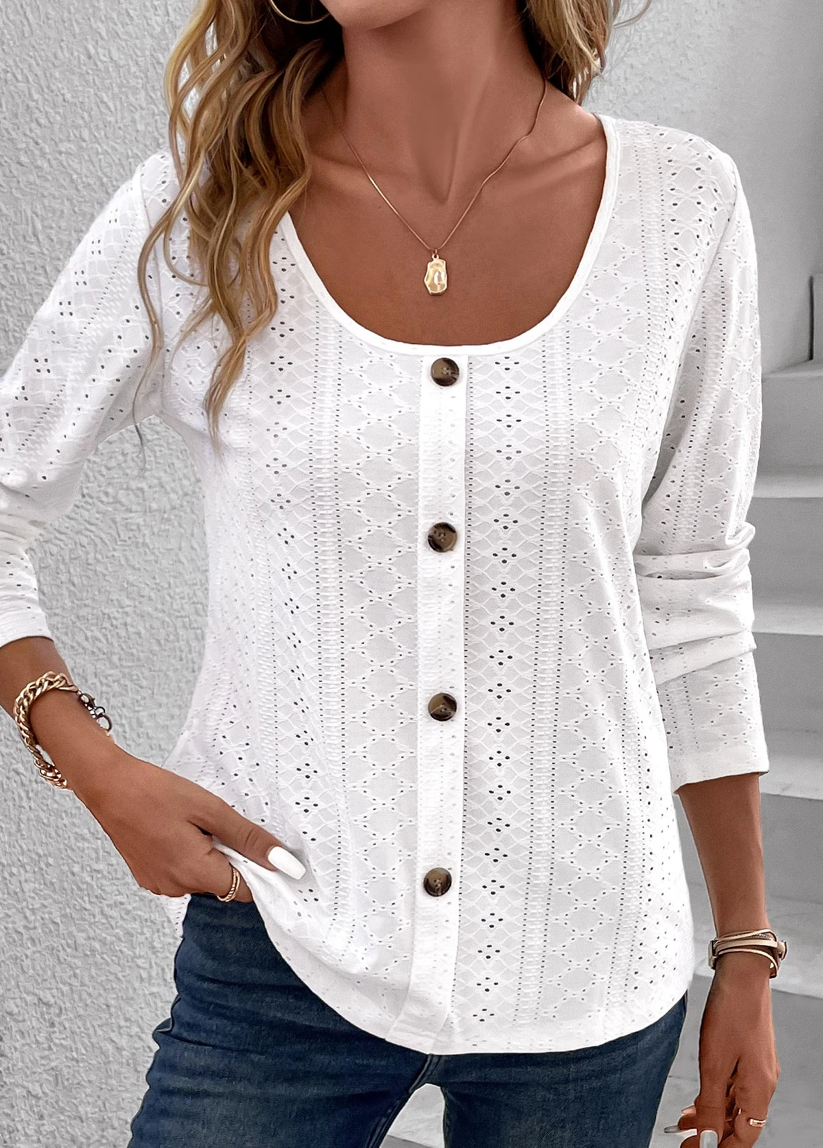 White Button Long Sleeve Scoop Neck Hollow T Shirt